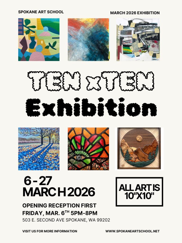 From emerging voices to established regional artists, this exhibition highlights the range and richness of our creative community here in Spokane Art School. Painting, mixed media, abstraction, realism, and everything in between—each square offers a distinct perspective, unified by shared scale.